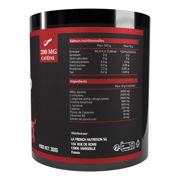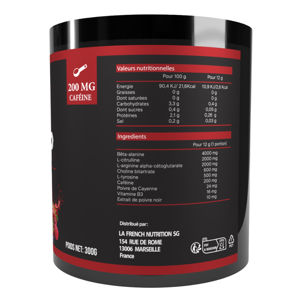 Bêta-alanine, I-citrulline, L-arginine alpha-cétoglutarate, correcteur d'acidité - acide citrique, bitartrate de choline, cellulose microcristalline, L-tyrosine, maltodextrine, caféine, arôme, antiagglomérant : oxyde de silicium, édulcorants : acésulfame K, sucralose colorant alimentaire: rouge de betterave, poivre de Cayenne, vitamine B3, extrait de poivre noir.